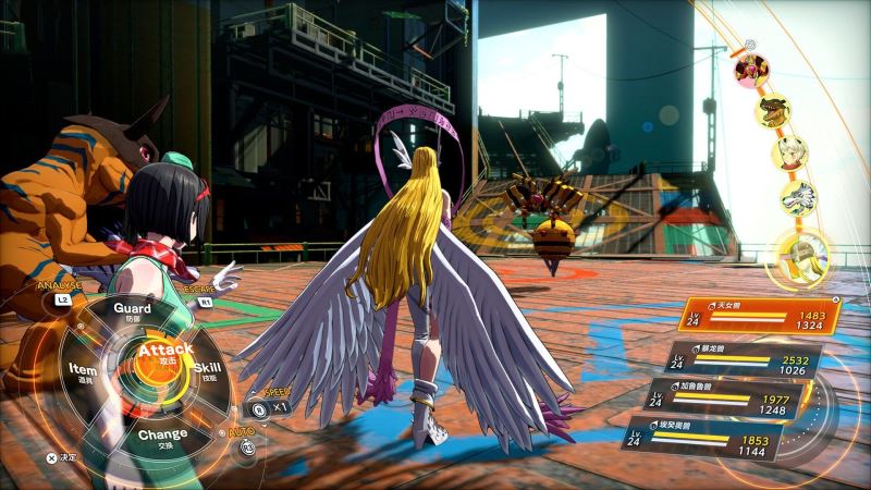 先介紹一下本作的核心玩法,大體上是比較傳統(tǒng)的回合制戰(zhàn)斗,玩家可派出3只數(shù)碼獸一同作戰(zhàn),按照敏捷高低輪番出招。在玩家“背包”中還可以額外攜帶3只數(shù)碼獸備戰(zhàn),戰(zhàn)斗中可以隨時切換上場。在每個數(shù)碼獸行動時,都可以進行替換一次數(shù)碼獸、使用一次道具,并且依舊能使用招式。除了自行配備的6只數(shù)碼獸外,流程中還有3個協(xié)助作戰(zhàn)的劇情數(shù)碼獸,并且都是由玩家操控。在結合上屬性克制、解除異常、回復體力、交叉技藝等方面因素,一回合內(nèi)可以做的決策還是不少的。