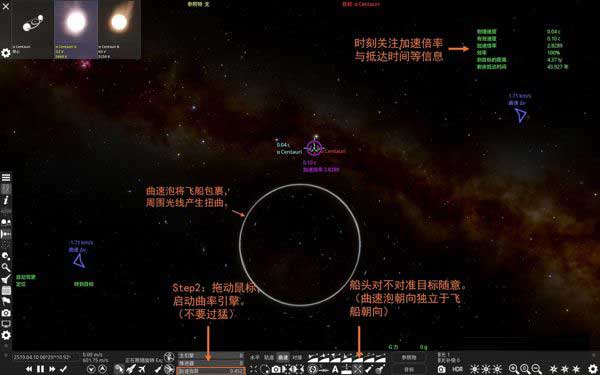 光年尺度的航行將放大一切誤差,接近目的地時(shí)請重復(fù)以上步驟,修正曲速泡航向。保證紫色曲速泡方向永遠(yuǎn)指向目標(biāo)。