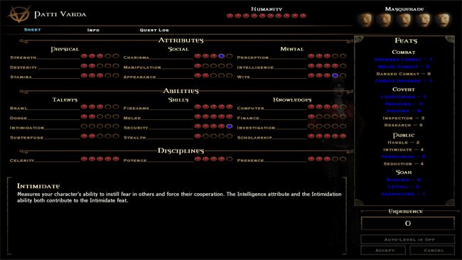 在避世戒律左邊便是人性,最高十點,在設(shè)定中每個吸血鬼都要面對自己的心獸,它是代表吸血鬼純粹獸 性的內(nèi)在,過低的人性容易更將這只野獸引出來,游戲中當玩家血池點數(shù)觸底時就會觸發(fā)發(fā)狂狀態(tài)(是否觸發(fā)需要通過檢定,而。人性值是主要影響因素),無差別攻擊附近的人,這便是被心獸占據(jù)的表現(xiàn)。