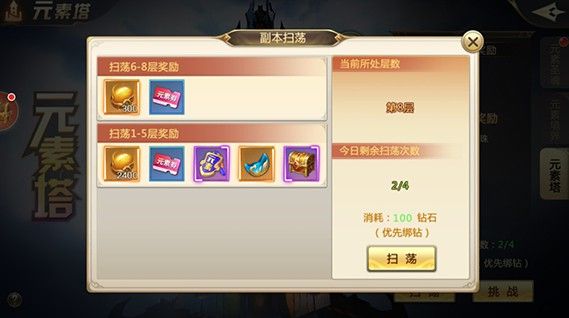 每天凌晨5點系統(tǒng)會系統(tǒng)刷新元素塔的掃蕩,對了上邊還有一點得加上,當(dāng)每天挑戰(zhàn)完畢元素塔時候技能掃蕩,首次免費,掃蕩會獲得各種升級元素的道具和元素券,這個可以抽取提升元素的碎片,還有合成仙珠的碎片,仙珠唯一出處,合成仙珠必須過了10級元素塔,所以這里有難度!