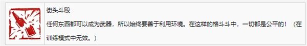 任何東西都可以成為武器,所以始終要善于利用環(huán)境。在這樣的格斗斗中,一切都是公平的?。ㄔ谟?xùn)練模式中無效。)