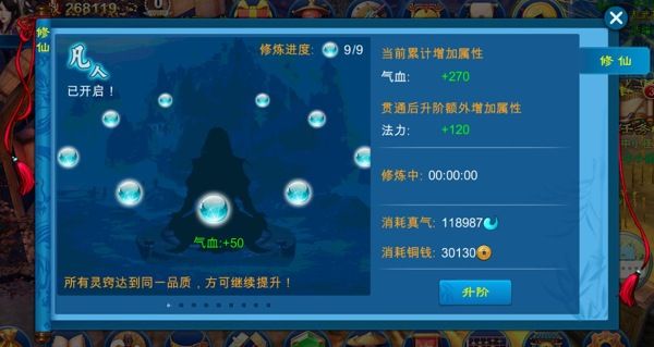3、每條修仙線路均需修煉滿后才可進(jìn)行升階,升級消耗真氣和銅幣,但是升階紫色和橙色還需要消耗指定道具【千年神水】;
