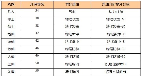 4、每條修仙線路開啟等級不同,所增加屬性也不相同。