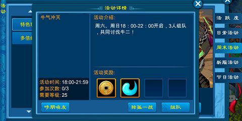 周六、周日18:00-22:00開啟,亂舞蒼穹、百鬼夜行、野外副本、探寶副本都可以獲得雙倍經(jīng)驗(yàn)的加成,別錯(cuò)過哦。