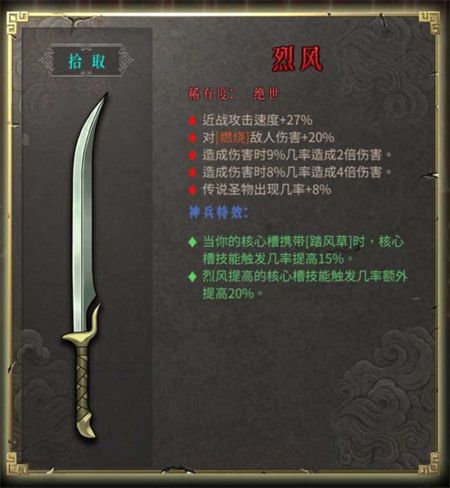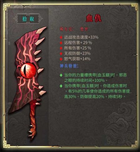 受到致命傷時(shí):使你的生命無法降低到15%以下,該效果發(fā)動(dòng)后需要施放怒氣技能后才能再次觸發(fā)。