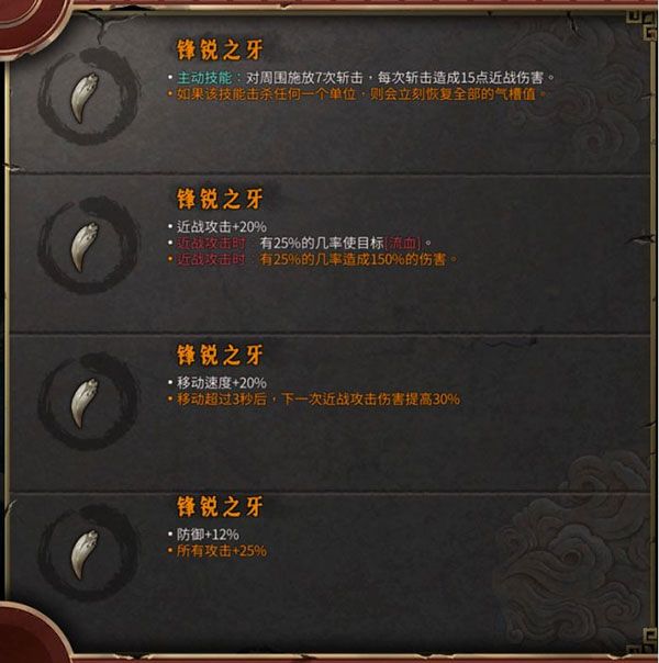 近戰(zhàn)攻擊時(shí):有25%的幾率使目標(biāo)流血,有25%的幾率造成150%的傷害鋒銳之牙。