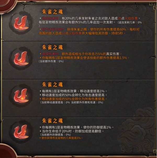 造成傷害時(shí):有20%的幾率發(fā)射朱雀之炎對(duì)敵人造成25點(diǎn)火焰?zhèn)?,每層圣物精煉效果?huì)有額外5%的幾率追加一次發(fā)射。
