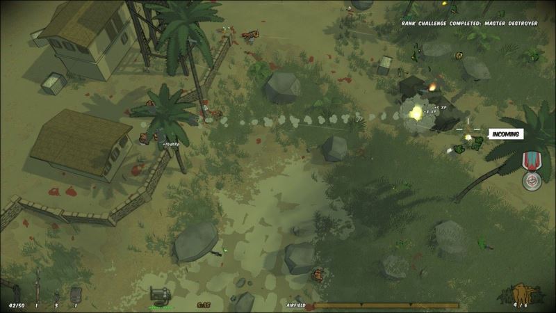 玩家以第三人稱俯視角控制角色進(jìn)行戰(zhàn)斗,可通過擊殺敵人、破壞敵方載具等方式獲得經(jīng)驗(yàn)值(XP),還可通過售賣拾取或殺敵后掉落的武器、占領(lǐng)基地等獲取資源點(diǎn)數(shù)(RP),以此提升軍階。隨著軍階提升,能使用更強(qiáng)大的武器,增加小隊(duì)成員上限,呼叫空投等。