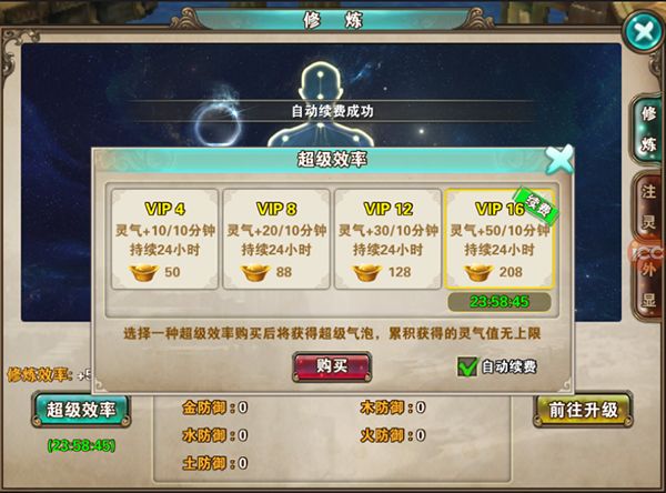 可按自身需求勾選自動續(xù)費,當超級效率時間失效時系統(tǒng)會自動扣除元寶續(xù)費。