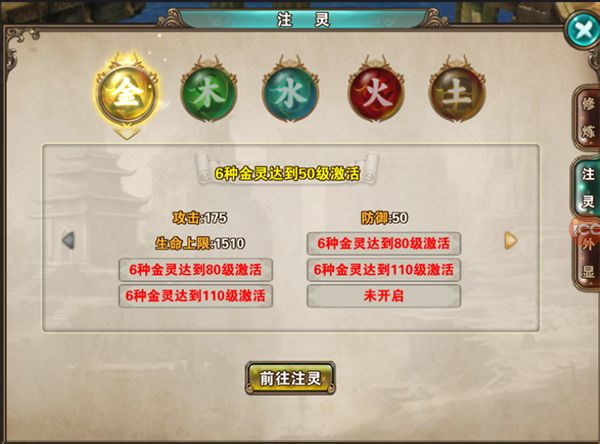 每個五行之靈下面有6個對應(yīng)子靈,通過注靈提高子靈的等級,可獲得五行屬性的提升,6個子靈等級達到一定等級條件時還能激活五行之靈的額外屬性,在五行之靈界面點擊左右翻頁查看可激活的額外屬性與條件