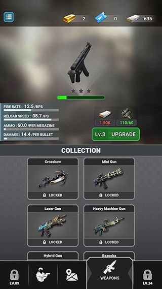 8、隨著金幣的不斷增多,我們還可以解鎖手弩、輕機(jī)槍、加特林等武器,