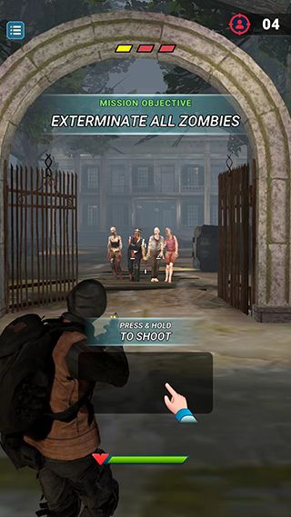 3、通過滑動(dòng)屏幕瞄準(zhǔn)目標(biāo)就會(huì)進(jìn)行射擊,紅條代表喪尸的血條,