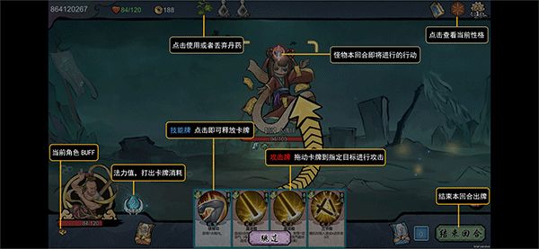 3、當出現(xiàn)戰(zhàn)斗關卡時,玩家需要利用卡牌將敵人擊敗,可以通過下圖對戰(zhàn)斗模式進行了解