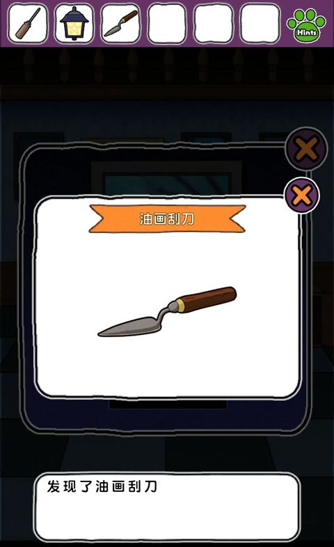 12、返回最初的房間,用螺絲刀把左側的燈卸下來,向右到達有紅色沙發(fā)的房間,點擊第一幅畫,用螺絲刀卸下銘牌,獲得刮刀。