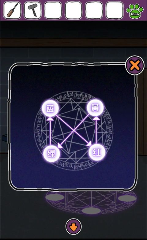 21、對城堡里所有蝙蝠的眼睛使用手電,獲得提示黃 8、紅3、綠4、紫2。