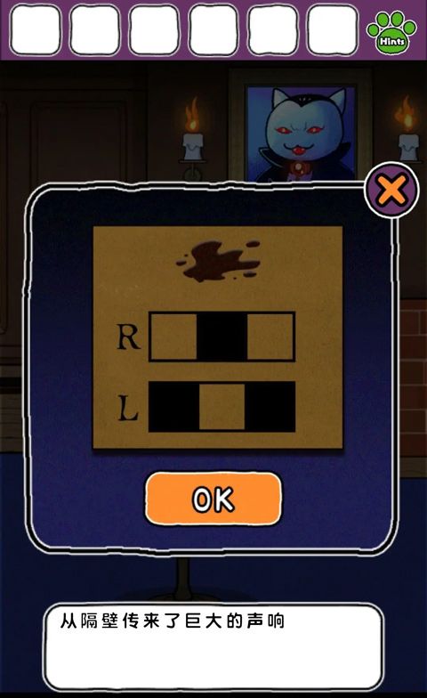 9、前往最初的房間,查看兩側石雕底部柱子獲得提示,返回有吸血鬼畫像的房間,點擊畫像下密碼箱,用墨水對相應的位置進行染色。