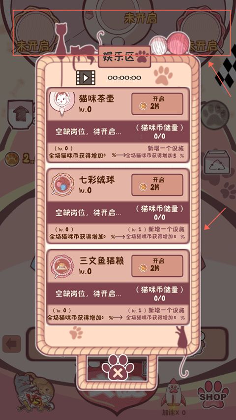 3、點(diǎn)擊上方的“未開啟”就來到了娛樂區(qū),你可以使用金幣開啟貓咪茶壺、貓糧等等。