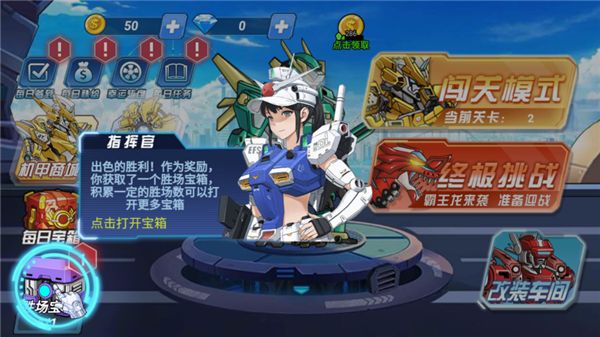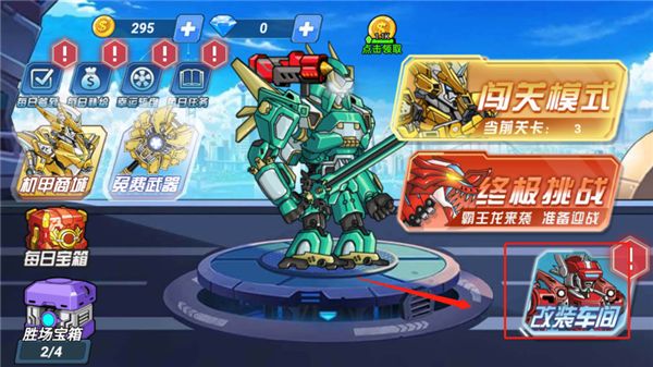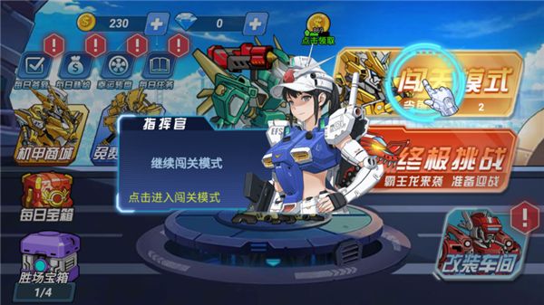 4、點(diǎn)擊“闖關(guān)模式”,闖關(guān)模式是這款游戲主要戰(zhàn)場(chǎng),在其中擊敗機(jī)甲可以獲得更強(qiáng)的部件,讓你的機(jī)甲站長(zhǎng)變得更強(qiáng)。