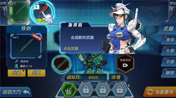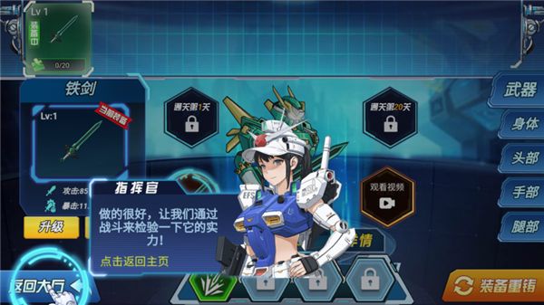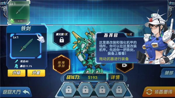 2、這里是改裝和強(qiáng)化機(jī)甲的場(chǎng)所,你可以在這里改裝機(jī)甲,拖動(dòng)武器進(jìn)行裝備。