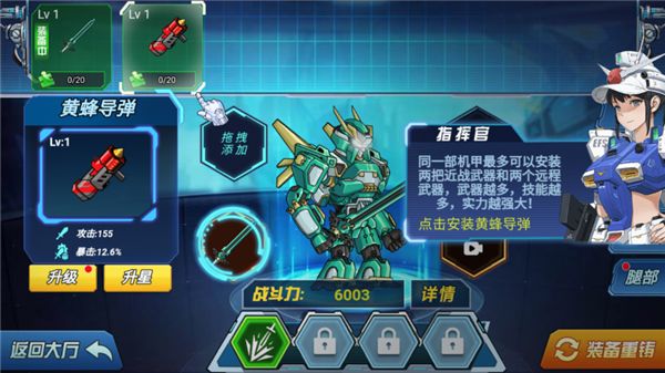 14、點(diǎn)擊安裝黃蜂導(dǎo)彈,因?yàn)橥徊繖C(jī)甲最多可以安裝兩把近戰(zhàn)武器和兩個(gè)遠(yuǎn)程武器,武器越多,技能越多,實(shí)力幾越強(qiáng)。