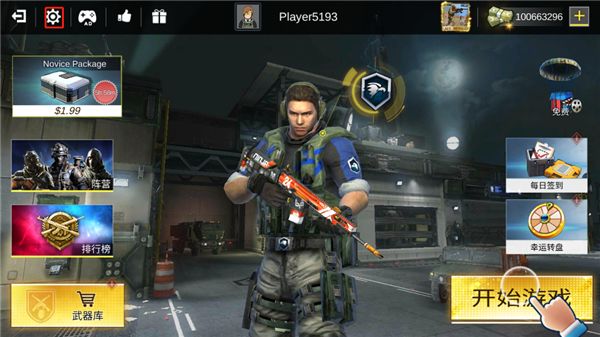 1、打開在本站下載的打擊力量英雄最新版,進入首頁我們可以看到有陣營、排行榜、武器庫等等功能板塊,我們可以先點擊齒輪狀的設置鍵