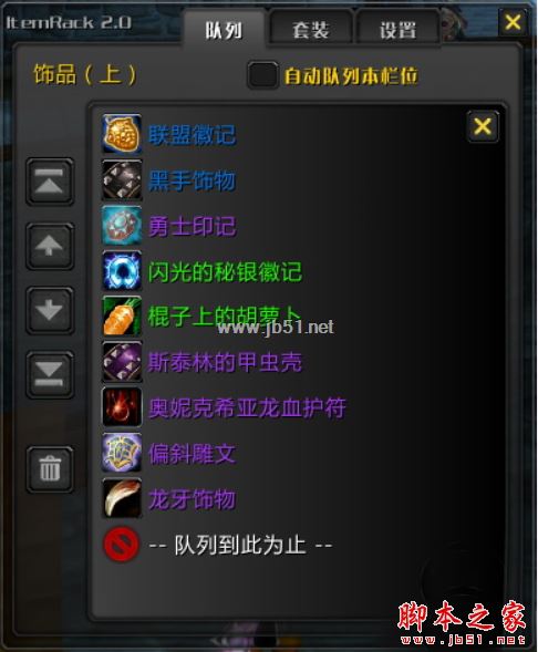 從2.0開始ItemRack加入了新的隊列系統(tǒng)(Auto Queue),其目的就在于當物品被使用后(主要是飾品),可以根據(jù)事先設(shè)定的序列自動更換飾品,當冷卻完畢后,再將飾品換回來。右鍵點擊小地圖按鍵進入選項菜單,點擊隊列頁面,選擇一個你想要進行隊列操作的欄位,比如上部飾品,選中“自動隊列本欄位”,并按想要更換的順序排列飾品,例如:[聯(lián)盟徽記] [生命寶石] [黑手飾物] ,則在你使用了聯(lián)盟徽記后,會自動更換為生命寶石,再使用,則更換為黑手飾物,當聯(lián)盟徽記冷卻完畢,再次更換回徽記。