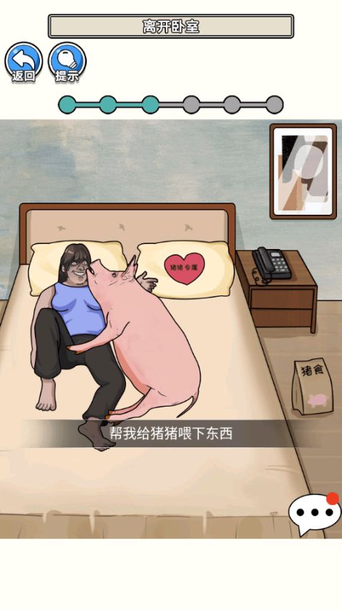 6、來到媽媽的房間,她好反常,叫你給豬喂食,這個(gè)時(shí)候你要想辦法離開 房間,先點(diǎn)擊右下角的消息查看規(guī)則吧。