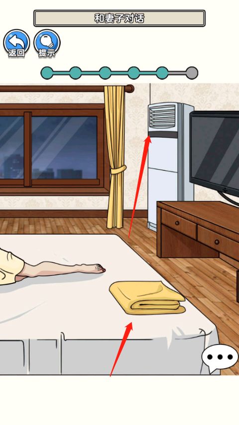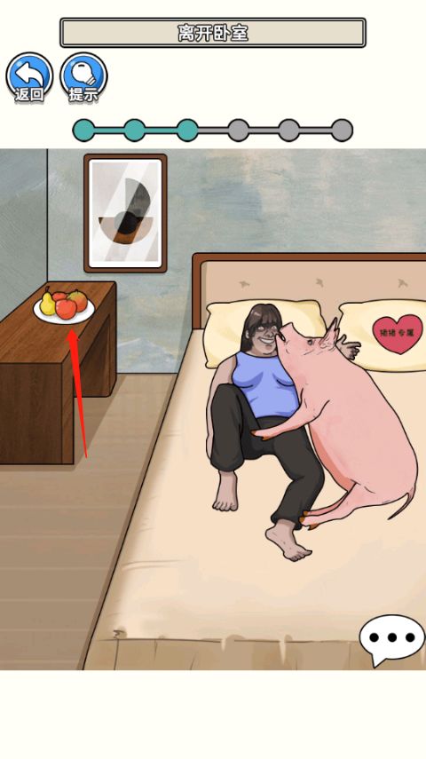 7、想要離開 房間就向右滑屏幕,找到水果并點(diǎn)擊它,讓媽媽先吃水果,隨后查看房間右邊點(diǎn)擊電話,媽媽就會(huì)想要去上廁所了。