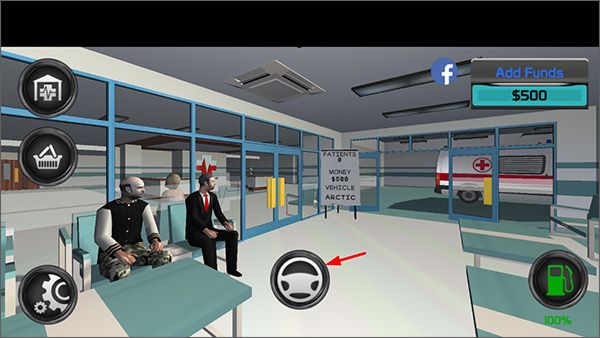 1、玩家打開急救車模擬器游戲,進入游戲主頁面,在該頁面中玩家可以查看當(dāng)前駕駛的急救車設(shè)置和油量等信息,點擊車輛方向盤按鈕;