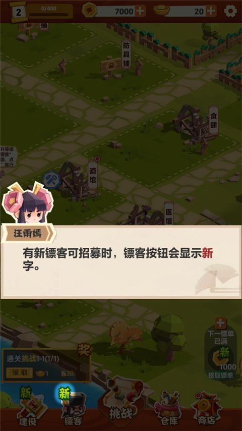 8、點(diǎn)擊建造按鈕,建立一個(gè)自己的酒館,鏢客失落的時(shí)候會(huì)到你這里買酒喝并付給你銅錢,升級(jí)酒館可以讓鏢客更快大氣精神去接下一鏢;