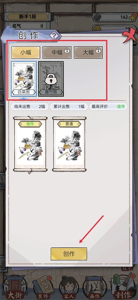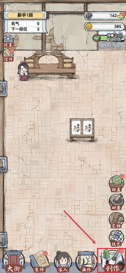 1、進入游戲后,你將需要經(jīng)營一家畫室,而經(jīng)營畫室首先需要創(chuàng)作畫作,點擊右下角創(chuàng)作畫作