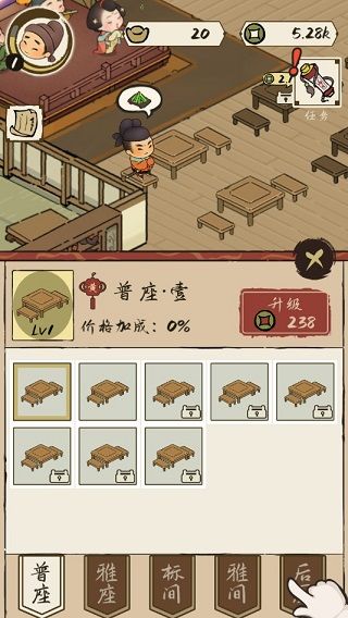 另外,想要提升營(yíng)業(yè)的規(guī)模,資金的來(lái)源是重中之重,在這里我們可以通過(guò)升級(jí)桌椅來(lái)提高價(jià)格。操作放置,點(diǎn)擊“經(jīng)營(yíng)”,在普座中選擇升級(jí)即可!