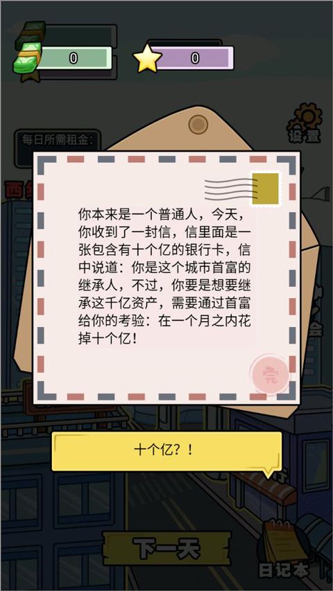 1、玩家打開億個小目標(biāo)游戲,了解游戲背景,玩家在游戲中需要在一個月內(nèi)花掉十個億;