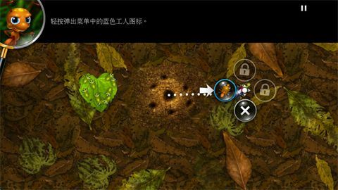 2、其次有意思的是游戲的操控方式。玩家需要指揮四種螞蟻:工蟻、士兵蟻、噴射蟻和飛蟻。工蟻和士兵蟻需要畫線指揮,玩家畫出一條虛線,工蟻就去收集尸體,士兵蟻就前去攻擊,很好理解。當(dāng)畫線的地方?jīng)]有敵軍或者沒有尸體的時候,長按這條虛線的地方,就可以把這個“指令”取消。噴射蟻需要進(jìn)入地洞里,并把地洞變成一個碉堡式的“塔”,它坐在里面噴射毒液來攻擊,同樣需要畫線指引它前去。飛蟻最為簡單,點擊屏幕任意地方它就會飛過去丟下炸彈。