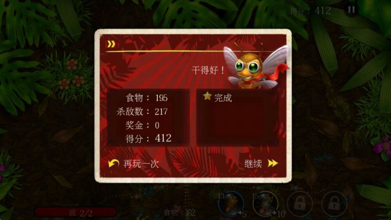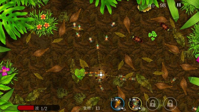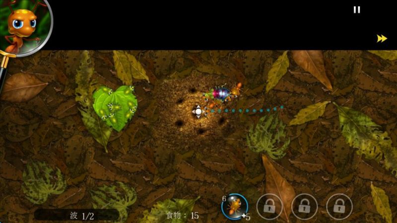 3、作為塔防,游戲采用了“波式”攻擊,玩家可以在屏幕左下方看到當(dāng)前的攻擊次數(shù)和總的攻擊次數(shù)。收集了多少食物決定了玩家可以派遣多少個螞蟻,每個螞蟻消耗的食物數(shù)量也不相同,這和其他塔防游戲的設(shè)定基本一致。需要注意的是,如何平衡攻擊和收集的比例是一個關(guān)鍵。狂出士兵不出工蟻不行,只出工蟻更不可取,所以玩家要做到一個平衡。