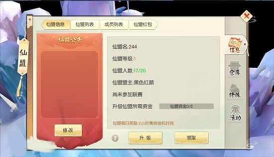 仙盟內(nèi)成員可通過(guò)幫派任務(wù)、日常任務(wù)、幫派活動(dòng)來(lái)增加仙盟資金,而仙盟資金可用于仙盟升級(jí),仙盟升級(jí)后可增加仙盟人數(shù)上限;另外仙盟內(nèi)成員可通過(guò)幫派任務(wù)獲得獸糧,上交獸糧后盟主和副盟主可開(kāi)啟仙盟boss挑戰(zhàn)。