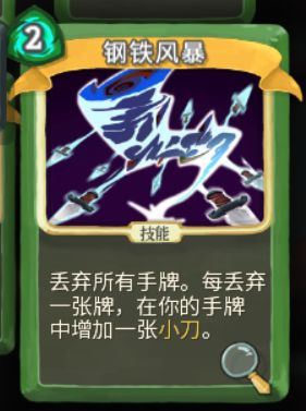 鋼鐵風(fēng)暴 稀有卡 2費(fèi) 丟棄全部手牌換來同等數(shù)量的小刀 升級(jí)費(fèi)用不變,換來升級(jí)過的小刀。