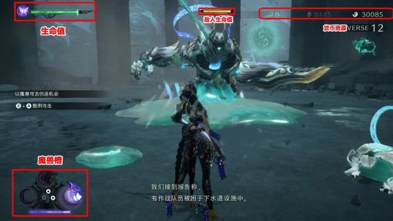 在戰(zhàn)斗中畫面左上角為角色的生命值。左下叫則為魔獸槽,本作中貝優(yōu)妮塔最多可以同時(shí)裝備三個(gè)惡魔奴隸。玩家可以通過十字鍵進(jìn)行切換。召喚惡魔奴隸需要消耗消耗下方紫色的魔力槽。魔力槽被消耗后會(huì)隨時(shí)間恢復(fù),攻擊以及進(jìn)入魔女時(shí)間都能快速增加魔力槽。