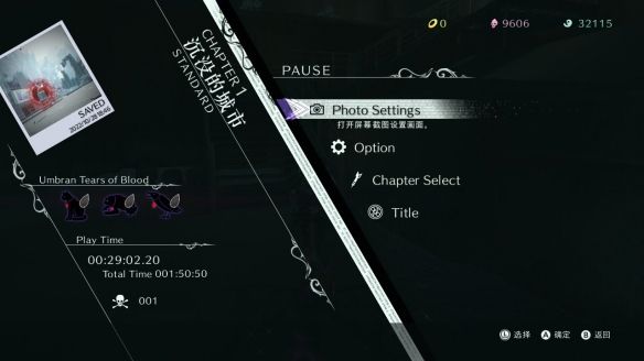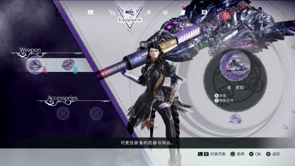 裝備界面,玩家能調(diào)整武器和飾品。武器影響貝優(yōu)妮塔的攻擊模式,可以同時(shí)裝備兩把武器,戰(zhàn)斗中按L鍵切換。飾品則會(huì)帶來一定的屬性能力加成。