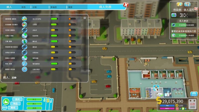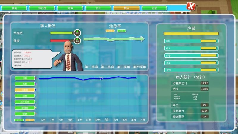 開醫(yī)院就是為了把病人治好,為了提高治療率,我們其實只需要關注病人的幸福度和健康度。病人幸福度歸零就會紅臉,然后離開醫(yī)院,拉低治療率。病人的健康度如果歸零就死了,還會變鬼嚇其他的病人。