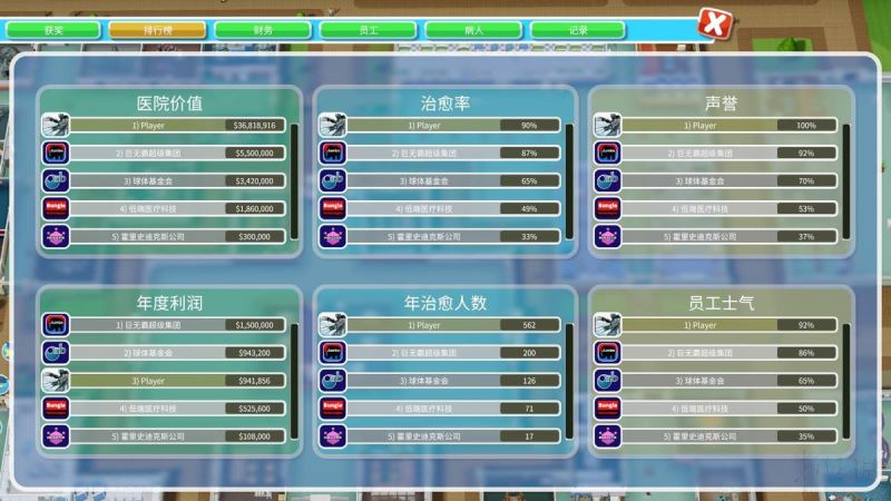 這是排名截圖,整體治愈率已經(jīng)90%,員工士氣92%。因為員工工資都是最大,所以整體利潤不高,每個月大概收入60w,支出50w,不過錢還是越來越多,現(xiàn)在快3000w,根本用不完。