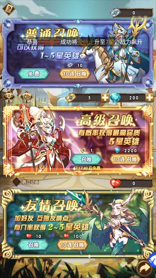 1、作為放置類游戲,最為關鍵的就是抽卡,大家可以在主城的英雄召喚處招募處抽取心儀的英雄哦;
