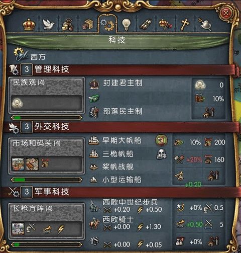 管理科技,外交科技,軍事科技,分別對應(yīng)行政、外交、軍事點數(shù),默認600點升級(唯一建筑大學(xué),解鎖理念,顧問,鄰國科技比你發(fā)達,可以降低你的科研費用,當(dāng)然也有一些增加科研費用的)。