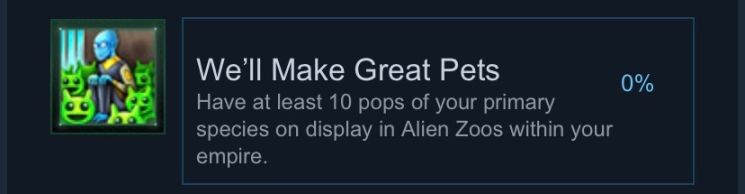 在你的帝國中,至少10個主要物種的人口被展覽在異星動物園中 有大于9個主要物種的人口在異星動物園崗位中。
