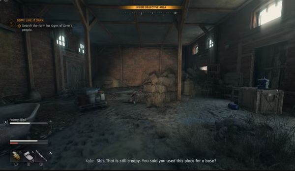 屋內(nèi)有兩名使用近戰(zhàn)武器的士兵。解決他們后,拿起桌子上的無(wú)線電。克蘭會(huì)冒充其中一名士兵,套出民兵關(guān)押斯文同伴的地點(diǎn)——養(yǎng)豬場(chǎng)。