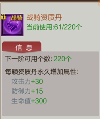 1.戰(zhàn)騎達(dá)到3階后,將可以喂食資質(zhì)丹,資質(zhì)丹可以百分比增加戰(zhàn)騎的進(jìn)階屬性;