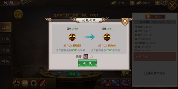 4.戰(zhàn)騎的技能可以通過(guò)使用戰(zhàn)騎技能升級(jí)書(shū)來(lái)進(jìn)行升級(jí),升級(jí)過(guò)后的技能增加更高的人物角色屬性。