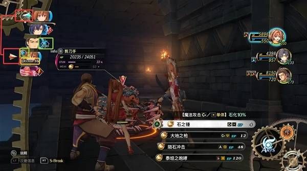 紅圈框選的左右箭頭代表上文解除驅(qū)動(dòng)板塊提到過的釋放魔法需要一定的驅(qū)動(dòng)時(shí)間,右下角我選擇魔法“石之錘”,左上角告訴我小艾從現(xiàn)在開始驅(qū)動(dòng),緊接著下一位角色小約行動(dòng),然后再下一位角色陣行動(dòng)之后,小艾驅(qū)動(dòng)完成,才能放出“石之錘”(引申:如果這個(gè)過程中敵方釋放了帶解除驅(qū)動(dòng)效果的技能,小艾就會(huì)被打斷,隊(duì)友也可以釋放一些加速技能,來減少小艾的驅(qū)動(dòng)時(shí)間)