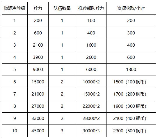 第1賽季資源地分為10級(jí),資源地守軍強(qiáng)度,獲取資源量如下。隨著資源點(diǎn)的等級(jí)提升,攻占資源點(diǎn)所需要的兵力也同步上升。小編給出了推薦攻占兵力需要。其中,村落守軍比起其他資源地守軍屬性更高,難度接近于下一級(jí)資源地。