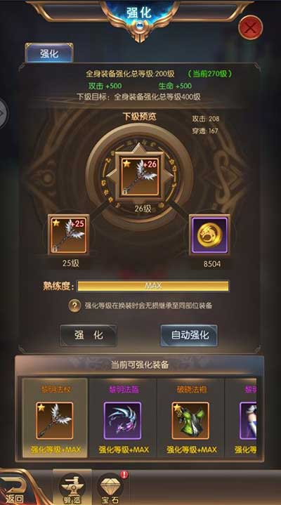 1. 直接強(qiáng)化:進(jìn)入各裝備的頁面均有一鍵提升功能自動(dòng)消耗所需耗材強(qiáng)化裝備